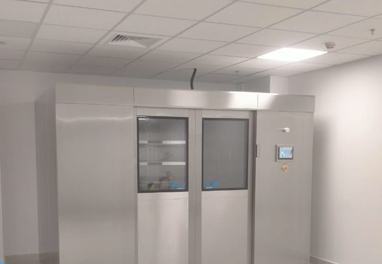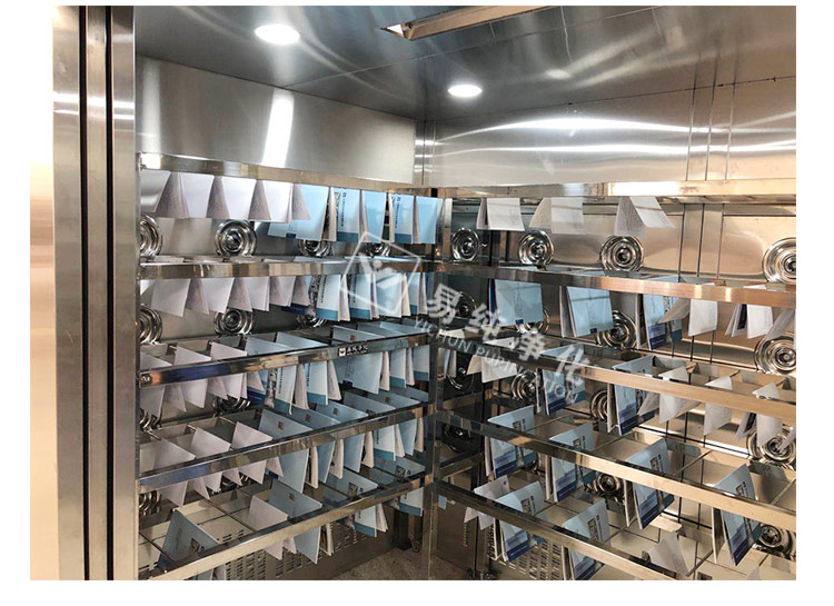 工作原理介紹:檔案消毒除塵室采用全不銹鋼材質(zhì)制作,進門為自動感應雙側是移門,人員觸碰按鈕后開門,將托盤送入到除塵室內(nèi),人員退出后關閉自動門,當門關閉后,除塵室內(nèi)啟動風淋除塵,此時自動門鎖閉,工作報警指示燈顯示為紅色狀態(tài),門無法打開。當除塵時間到達后,報警指示燈顯示為綠色并發(fā)出報警聲音,門為可開狀態(tài)。人員取出托盤,將之送入到庫房內(nèi)進行保存。